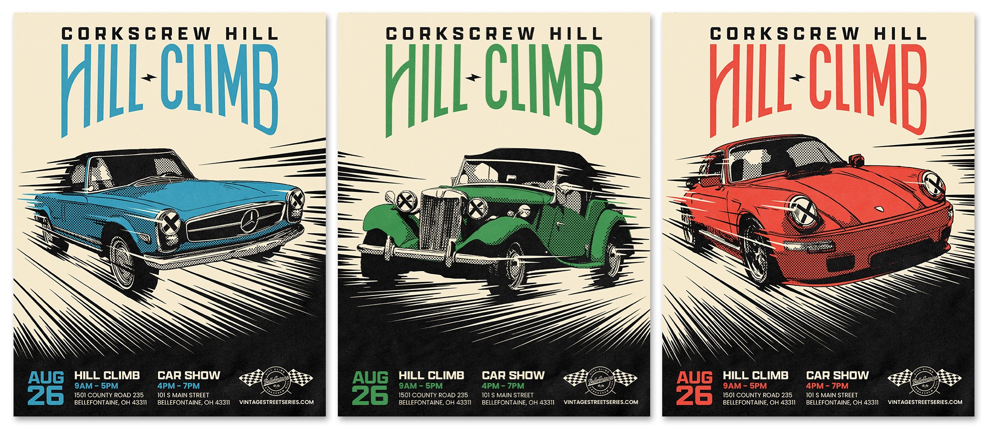 Throughout this project, a vintage motor-sport style is used as a throwback to the early 50s when the Corkscrew Hill Hill-Climb was first established. The color palette is minimal and utilizes warmer tones to convey the feeling of worn/vintage design. The type treatment is also handled in ways similarly to that which was seen in motor-sports back in the 50s and 60s. Each car on the posters and shirt designs represents one of the three races held at the event. The stickers were all designed with old-school racing sponsor logos in mind. The sticker with the “‘24” alludes to the year (as these designs would be used in 2024). All photography was taken at the 2023 Corkscrew Hill Hill-Climb.